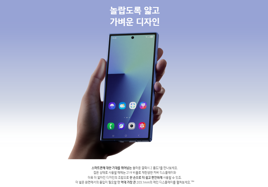 기대 그 이상. 상상 그 너머. 갤럭시 Z 폴드 7은 기존 ‘무거운 접는 폰’이 아니에요. 얇고, 가볍고, 넓고, 더 똑똑해졌습니다.