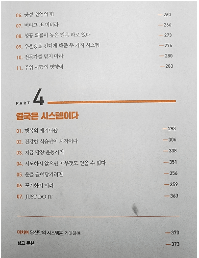 스콧애덤스는 마지막 4장에서 운과 시스템의 관계에 대해 말하고 있습니다. 운의 본질은 운은 우연이 아닌 꾸준한 노력과 시스템 구축을 통해 만들어지는 결과물입니다. 이미 배움으로 가득한 시스템은 예상치 못한 기회를 만들고 운을 극대화 합니다.