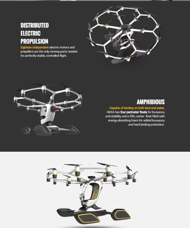 HEXA는 초경량 전기 항공기로, 기존의 헬리콥터보다 훨씬 조용하고, 친환경적인 에어 모빌리티를 지향합니다. 안전성 설계가 주목할만하다고 합니다. GPS 기반의 자동 비행 시스템과 비상시 낙하산 기능까지 탑재되어 있어 도심 내 운용 가능성에 힘을 싣고 있습니다.